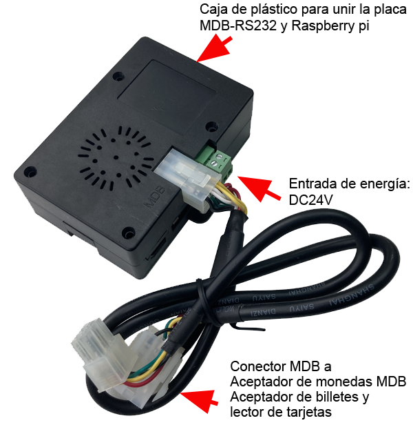 MDB Raspberry Pi Box es su buena solución para una integración de MDB con Raspberry pi. Puede adaptarse a un Raspberry Pi, una placa MDB2Pi y viene en una sola caja. Esto le brinda todas las características del MDB-RS232 y la conveniencia de combinarlo con el Raspberry pi.